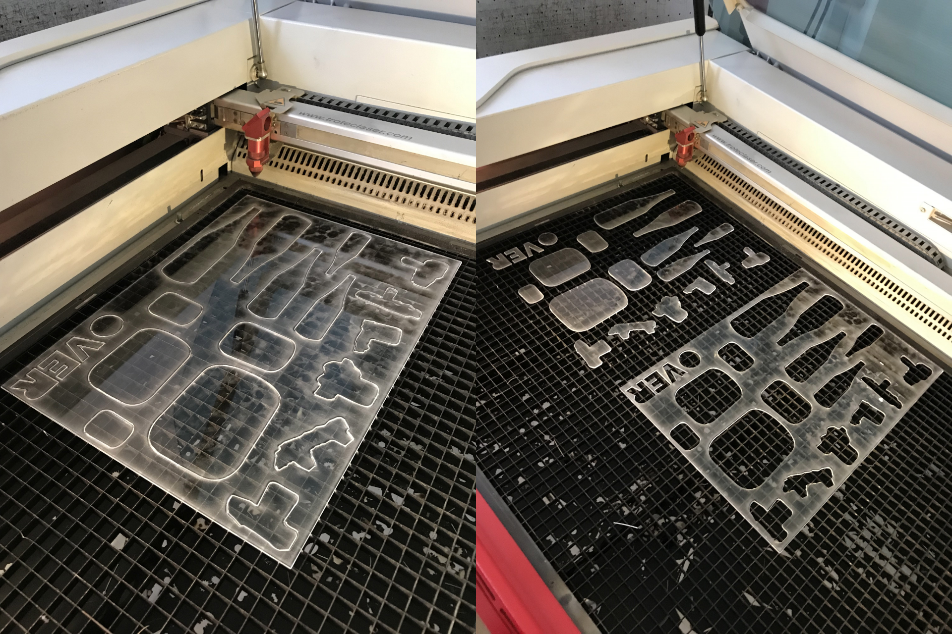 le processus de création numérique basé sur la découpe d’un matériau PMMA en plaque 3mm in fine à partir d’un outil de découpe laser type Trotec.